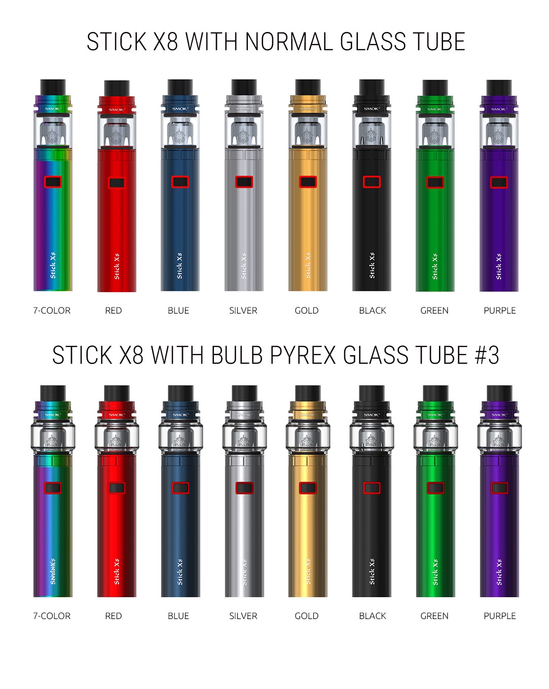 The Smok Stick x8 is the top airflow version of the Smok Stick V8, like the v8 it is a perfect kit for those wanting to get into sub-ohm vaping. The stick is a simple 3000mah regulated stick style mod. It comes with a TFV8 Big Baby tank, featurning a 5ml capacity.