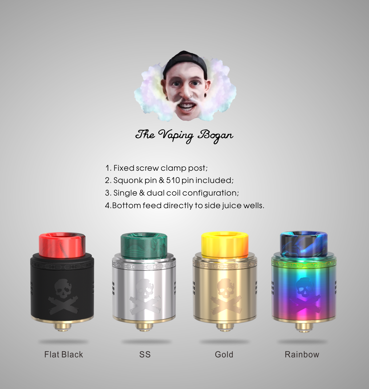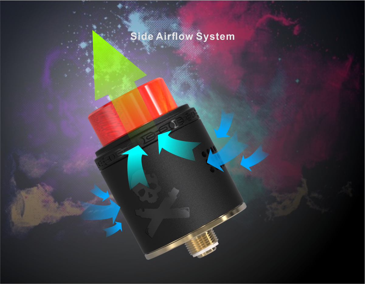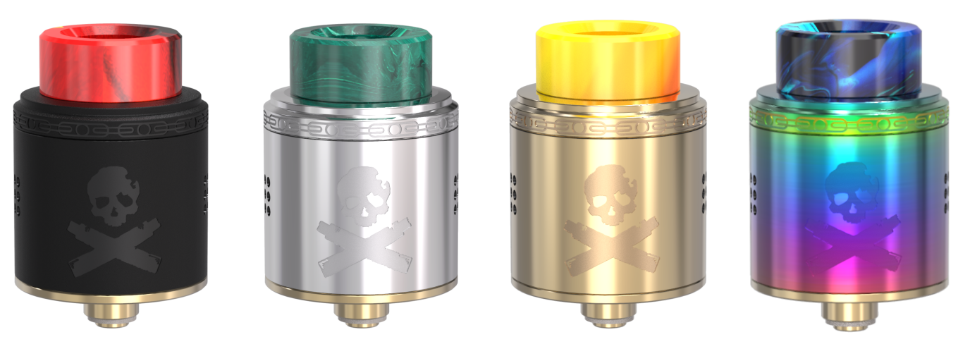 The Bonza RDA is 24mm and features a fixed screw clamp post that makes installing your duel or single coils a freaking walk in the park, a gold plated deck and it has some very nice adjustable side airflow as well. The cap features Vaping Bogan’s logo, a skull and cross mods. If that wasn’t cool enough, there is a colorful resin drip tip that is included. You like things a little less colorful? No problem there is also 16mm Black Delrin Drip tip, a 17.5mm Ultem Drip Tip and even a 510 adapter. The drip tip options with this bad boy is limitless. It also includes a squonk pin.